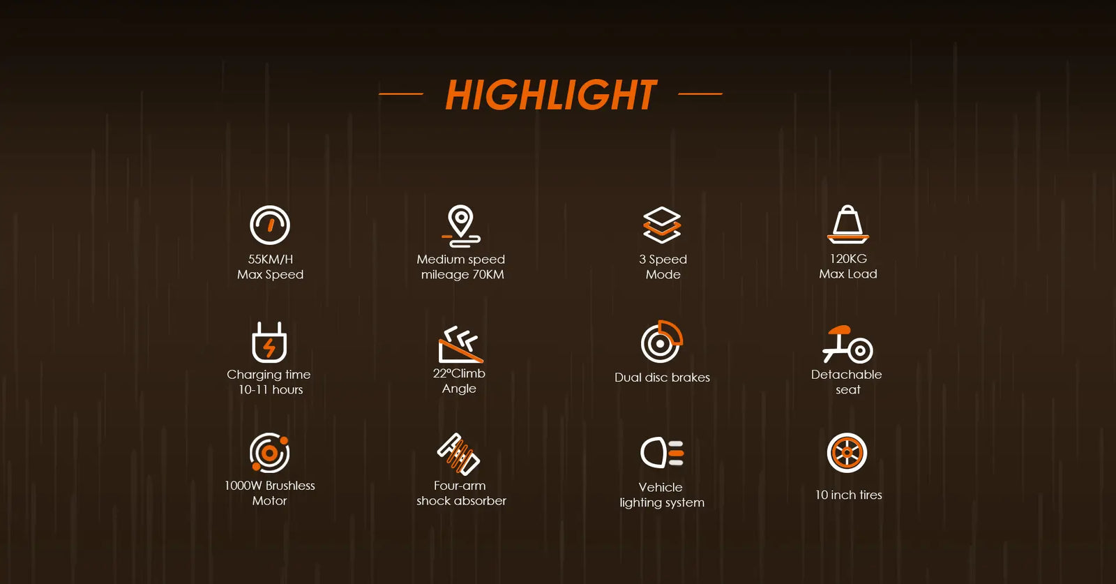 Pneu10 poucesLumièresLED intégréeFreinsFrein à disque avant et arrière et frein électriqueAmortisseurAmortisseur à ressort