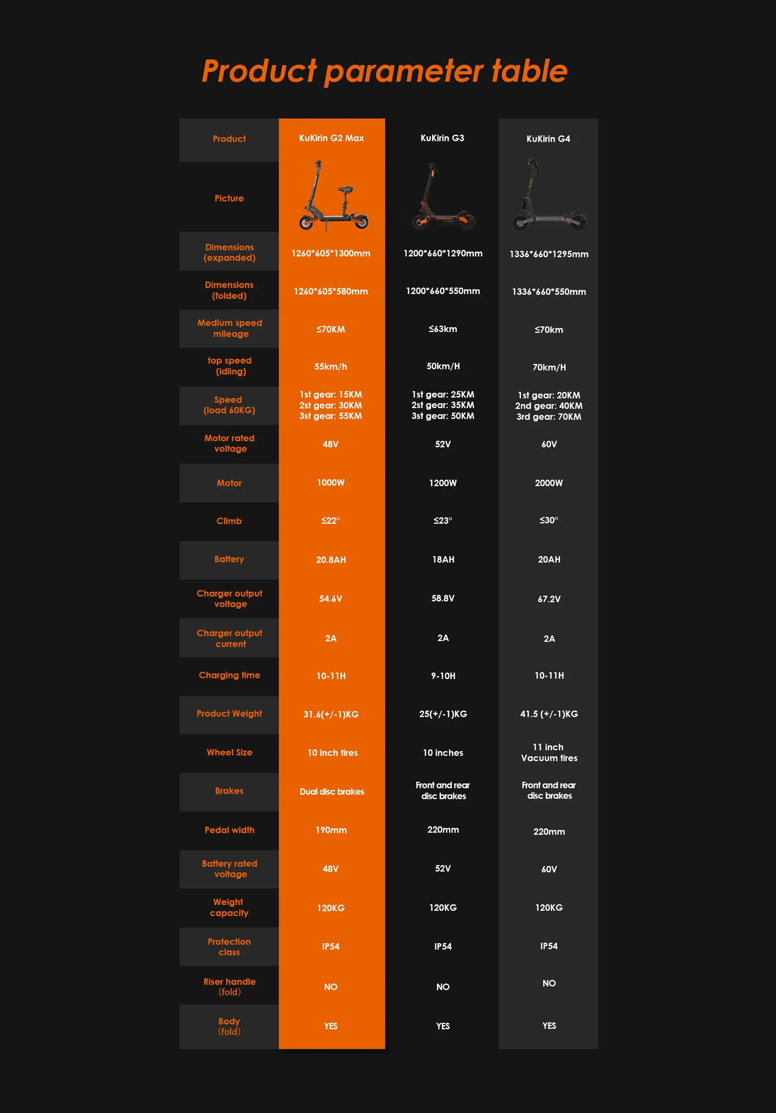 KuKirin G2 Max adopte des batteries lithium-ion de grande capacité 48V20.8AH de haute qualité, une capacité de sortie de courant à haut débit continu offrant une longue portée de 70 km, vous ne vous inquiétez donc plus du manque de portée.