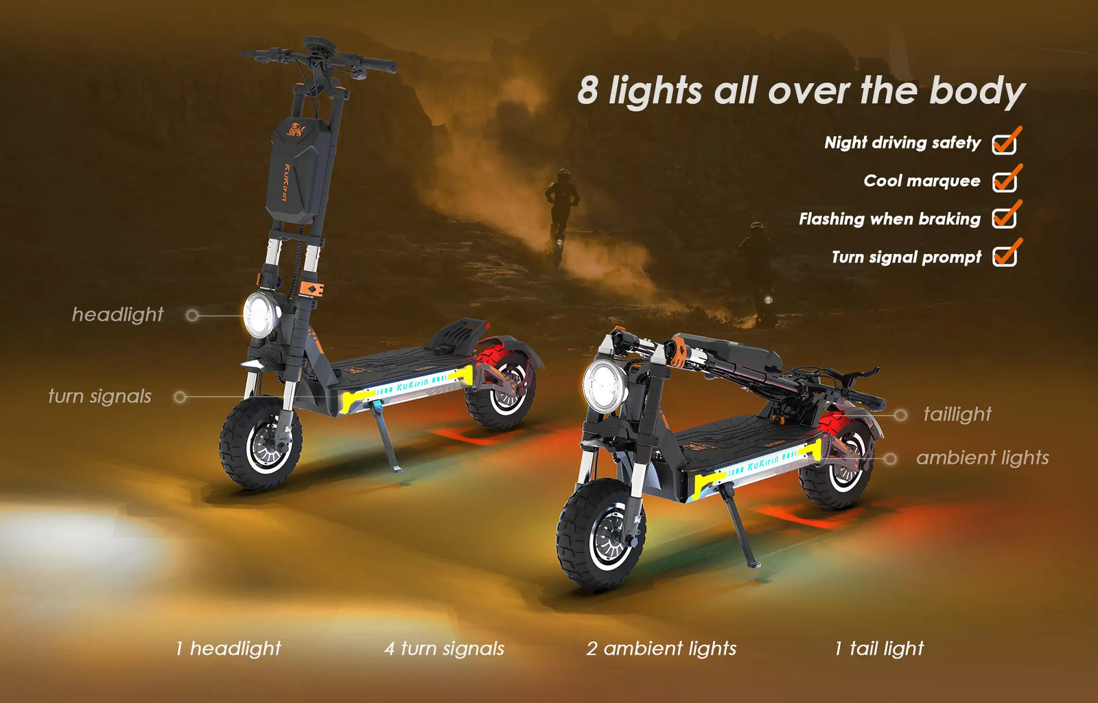 Les phares, feux arrière et clignotants à LED haute luminosité avec éclairage ambiant froid offrent non seulement un bon éclairage, mais garantissent également la sécurité entre les conducteurs.